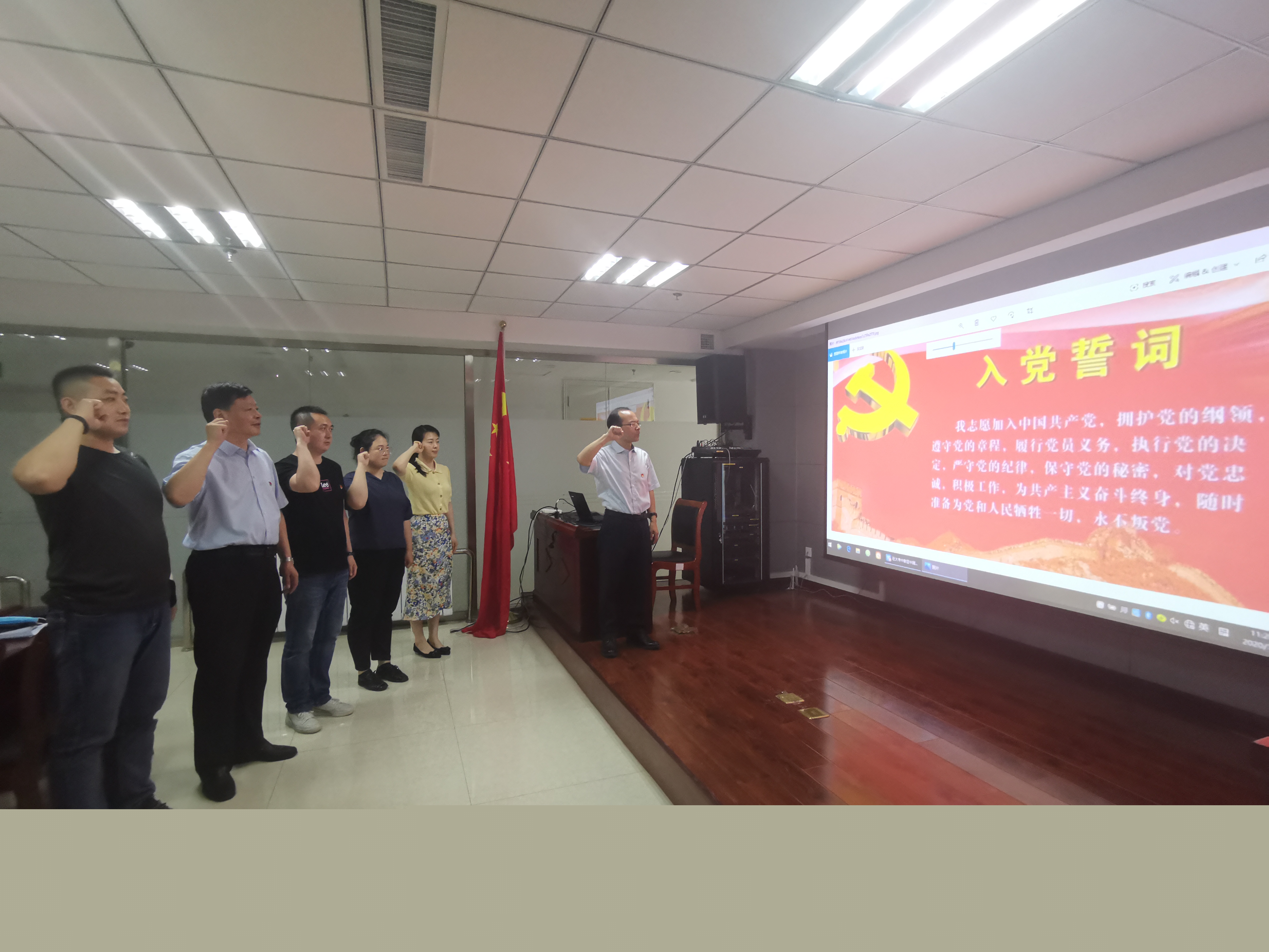 由黨支部書記焦俊良同志領(lǐng)誓,全體黨員面對鮮紅的黨旗,舉起右拳,莊嚴(yán)宣誓?!拔倚模何抑驹讣尤胫袊伯a(chǎn)黨,擁護(hù)黨的綱領(lǐng),遵守黨的章程,履行黨員義務(wù),執(zhí)行黨的決定,嚴(yán)守黨的紀(jì)律,保守黨的秘密,對黨忠誠,積極工作,為共產(chǎn)主義奮斗終身,隨時準(zhǔn)備為黨和人民犧牲一切,永不叛黨?!辩H鏘有力的誓言,讓每名黨員受到了一次深刻的黨性教育和政治靈魂洗禮。