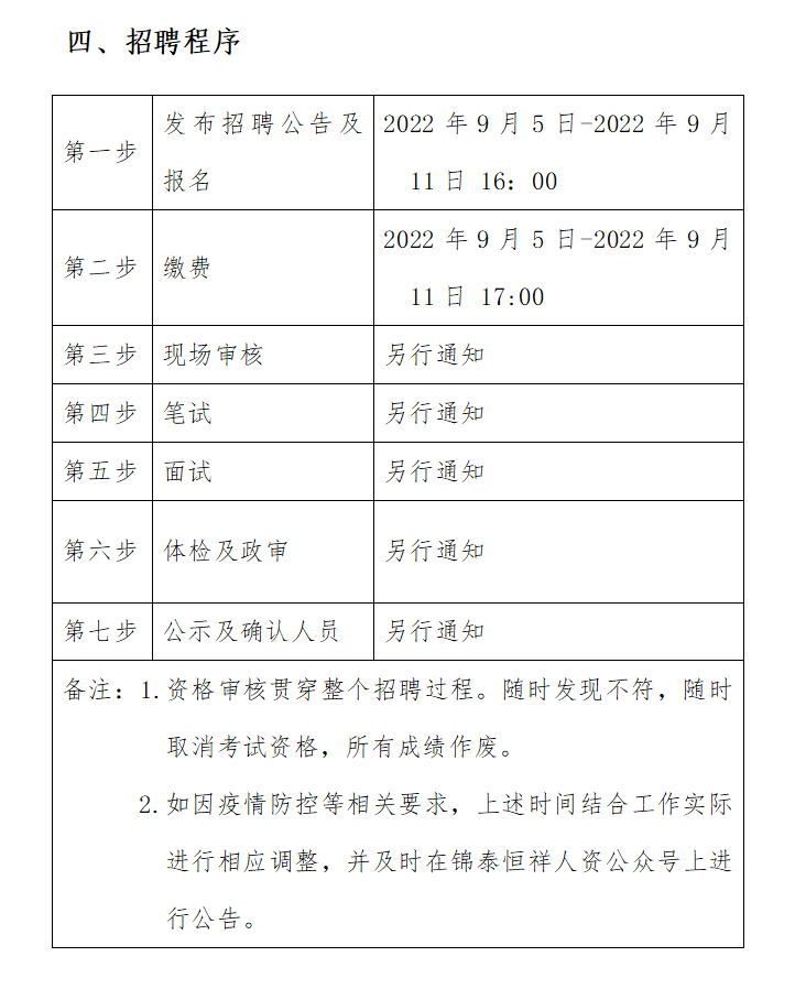 ?2022年9月5日-2022年9月11日16:00 在錦泰恒祥人資官網(wǎng)(www.jthxhr.com)、“錦泰恒祥人力資源服務(wù)有限公司”微信公眾號(hào)、“國(guó)控集團(tuán)”官方網(wǎng)站(m.robinherr.com)及上級(jí)部門要求的相關(guān)網(wǎng)站等發(fā)布招聘公告。